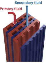Om het voordeel uit een kleinere reactor te halen, moet de warmte sneller en efficiënter worden afgevoerd. Daarvoor gebruiken ingenieurs microkanaal-warmtewisselaars: kleine metalen blokken vol ultrafijne kanaaltjes (micrometers in diameter) waar water kookt tot stoom en zo de warmte meeneemt (Figuur 1).