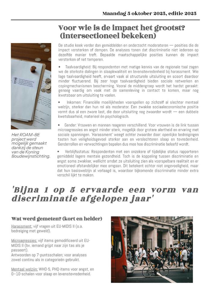Dit artikel bouwt op de ROAM-BE-survey (2024–2025) bij 923 deelnemers van Sub-Saharaanse herkomst, afgenomen in Brussel, Vlaanderen en Wallonië. De studie mat zowel microaggression als harassment met gevalideerde schalen, en linkte die aan vier indicatoren van mentaal welzijn: angst, slaapkwaliteit, levenstevredenheid en algemeen welbevinden. Deze cross-sectionele studie onderzocht wat het effect van deze vormen van raciale discriminatie is op de mentale gezondheid en keek daarbovenop nog eens vanuit een intersectioneel perspectief, welke individueën daar het meest door getroffen zijn.
