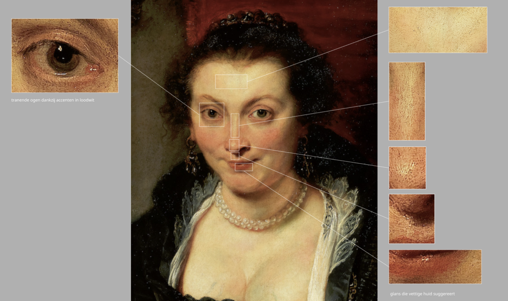 Vergelijk Rubens’ kopie met het originele portret van Willem Key. Bij Key contrasteren de lippen fel met de bleke huid. Ze ogen onnatuurlijk, bijna als maquillage. Bij Rubens zijn rode accenten verspreid over de lippen, wangen, neus, oor en nek. De kleur lijkt daardoor deel van de huid zelf. Vroegmoderne fysiognomen benadrukten toen al dat fysiognomische tekenen natuurlijk moesten ogen. Rubens wist dat. Ook qua huidtextuur zien we dat Rubens de huid dankzij gerichte witte toetsen veel vetter en levendiger doet ogen. Geen toeval, maar een visuele bevestiging van het warme, vochtige temperament.