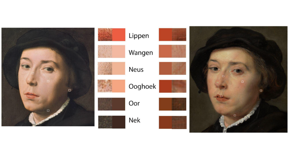 Veroudering van de verf door de jaren heen vergeelt het vernis waardoor we niet de oorspronkelijke kleuren zien. Warme kleuren lijken bijvoorbeeld doffer. Binnen eenzelfde werk focust mijn onderzoek daarom op de verspreiding en de plaatsing van kleuren en niet op de intensiteit van de pigmenten, omdat we hier geen zekerheid over hebben. Daarom ontwikkelde ik een kleurenkaart die deze verspreiding aantoont aan de hand van de pixel-fragmenten waar ik telkens één representatieve kleur van maakte. Zo wordt visueel aangetoond dat Rubens, in tegenstelling tot Key, de lipkleur verspreidt doorheen het hele gezicht.